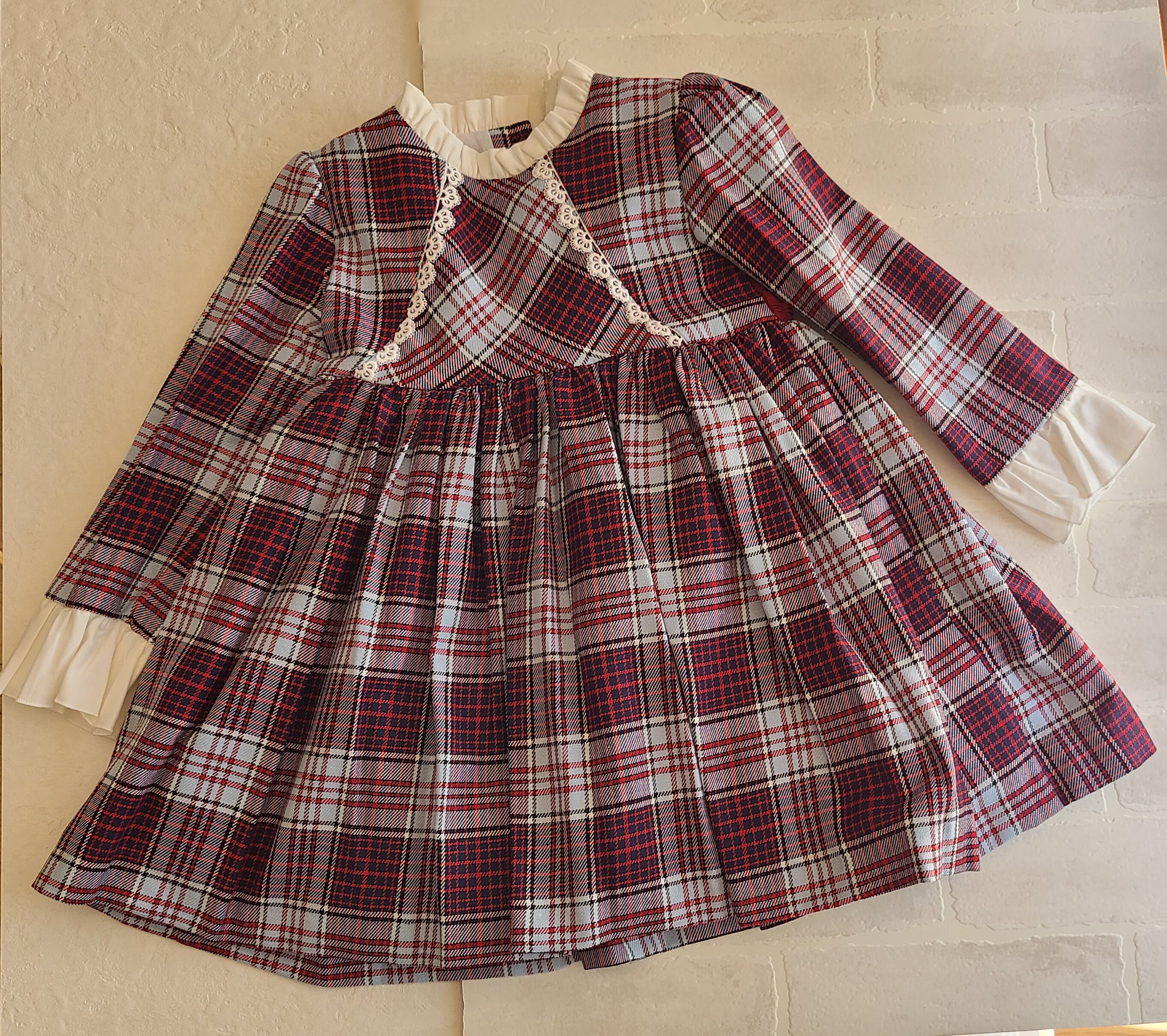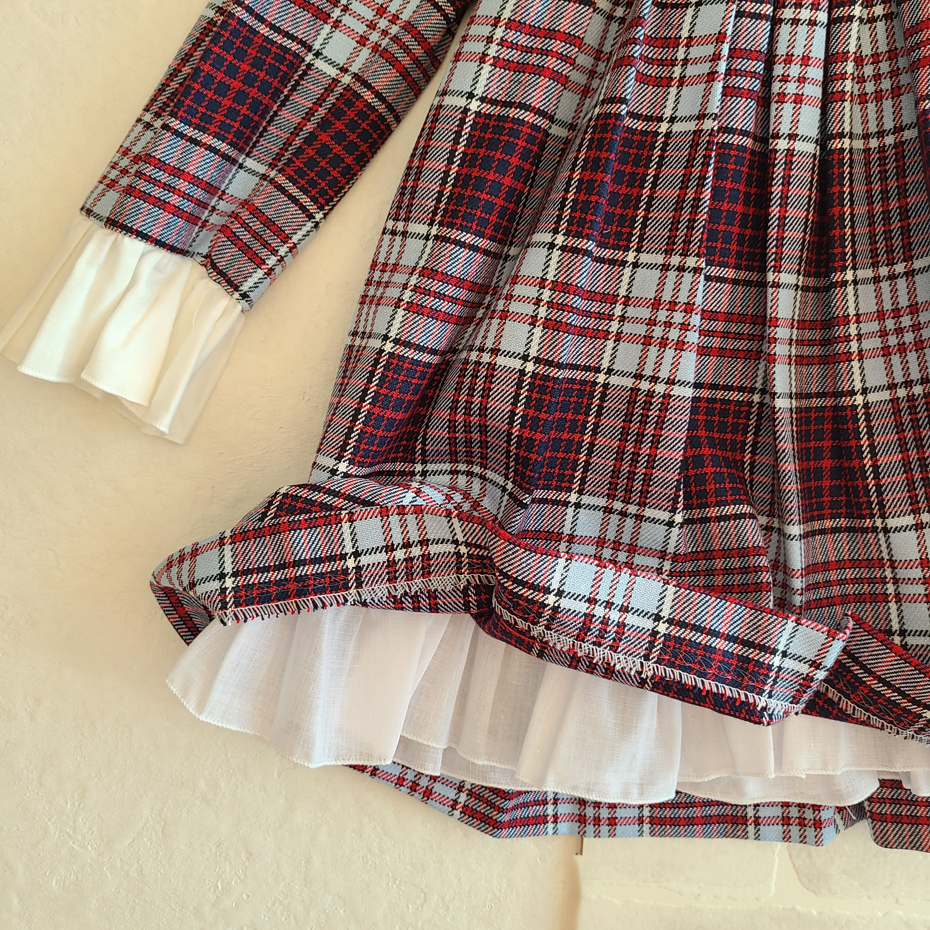 ロイヤルパープルという深い紫色のチェックにフリルのスタンドカラー。お袖にもフリルがついています。上品なドレスですのでこれからのフォーマルなイベントにおすすめです